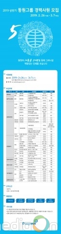 김인철 동원그룹 HR지원실장은 “이번 상반기 경력사원 모집은 2019년 창립 50주년을 맞은 동원그룹의 각 계열사별 경쟁력을 강화하고 새로운 50년을 함께할 역량 있는 인재들을 모시기 위해 진행된다”며 “우수한 인재들의 많은 지원을 바란다”고 말했다.